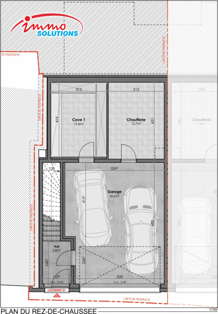 au rez-de-chausée: d'un hall d'entrée de 3.80m2, d'un grand garage pour deux voitures de 36.60m2, d'une cave de 13.30m2 et d'une chaufferie de 13.70m2.