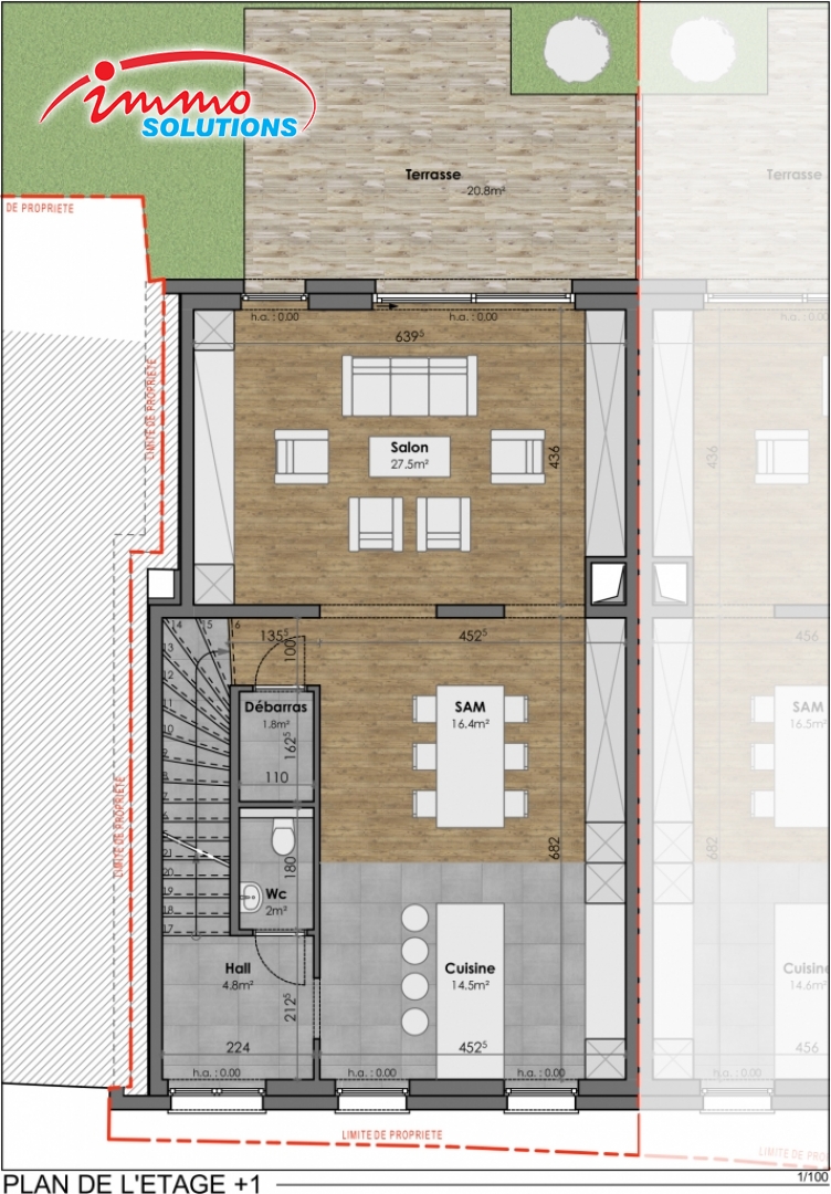 au 1er étage: d'un hall de 4.80m2, d'un débarras de 1.80m2, d'un WC séparé de 2.00m2 d'un séjour de 27.50m2 avec accès direct sur la terrasse de 20.80 m2 et le jardin, d'une salle à manger de 16.40m2 et d'une cuisine ouverte de 14.50m2.