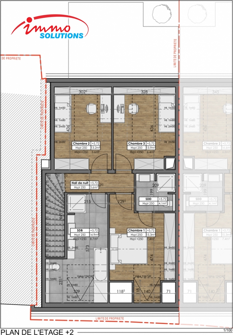 au 2ième étage : d'un hall de nuit de 5.72m2, de trois chambres à coucher (13.20m2+13.90m2+15.30m2), d'une grande salle de bain avec douche et baignoire de 14.90m2 et d'une salle de douche de 4.10m2.