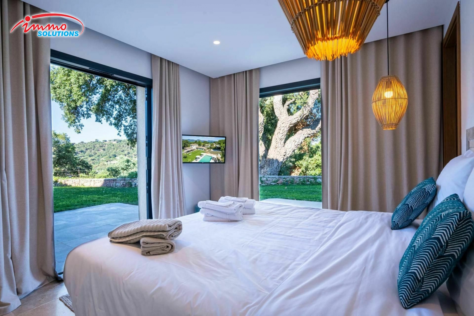 Cette dernière bénéficie d'une plage californienne ainsi que d'un pool house avec solarium sur le toit. De généreuses terrasses en pierre travertin et teck ainsi qu'un terrain de boule bordent la maison dans un espace naturel sur un terrain de 5150m2 avec helipad.