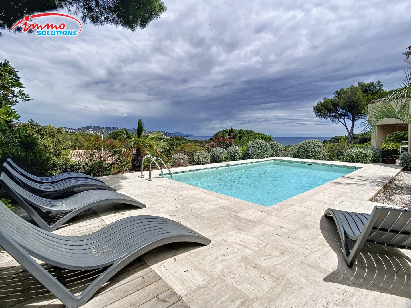 La propriété comprend une piscine traditionnelle entourée d'une belle plage en pierres naturelles, offrant une vue mer depuis ses eaux rafraîchissantes.