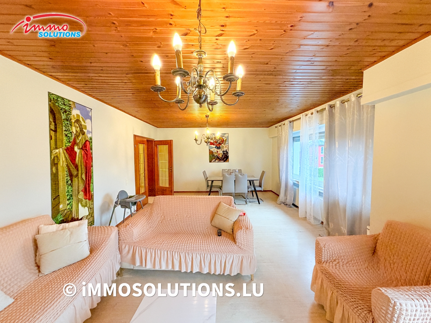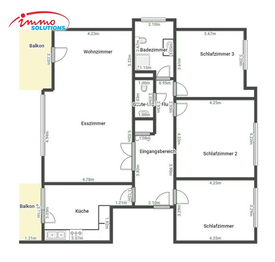 L'appartement se compose d'un hall d'entrée, d'une cuisine équipée séparée avec accès au balcon, d'un vaste séjour avec salle à manger bénéficiant également d'un accès à un second balcon, de trois grandes chambres à coucher, d'une salle de douche et d'un WC séparé.