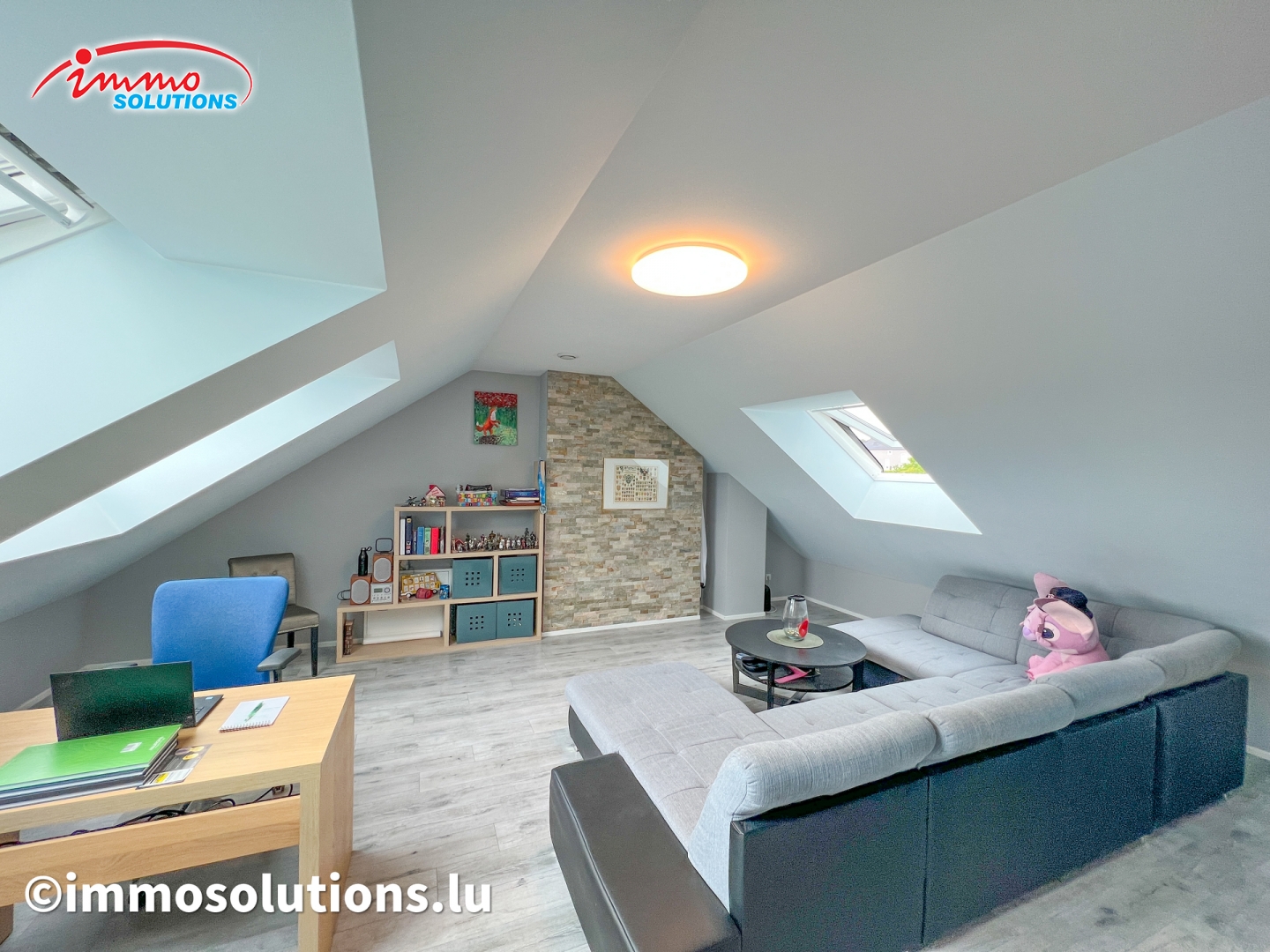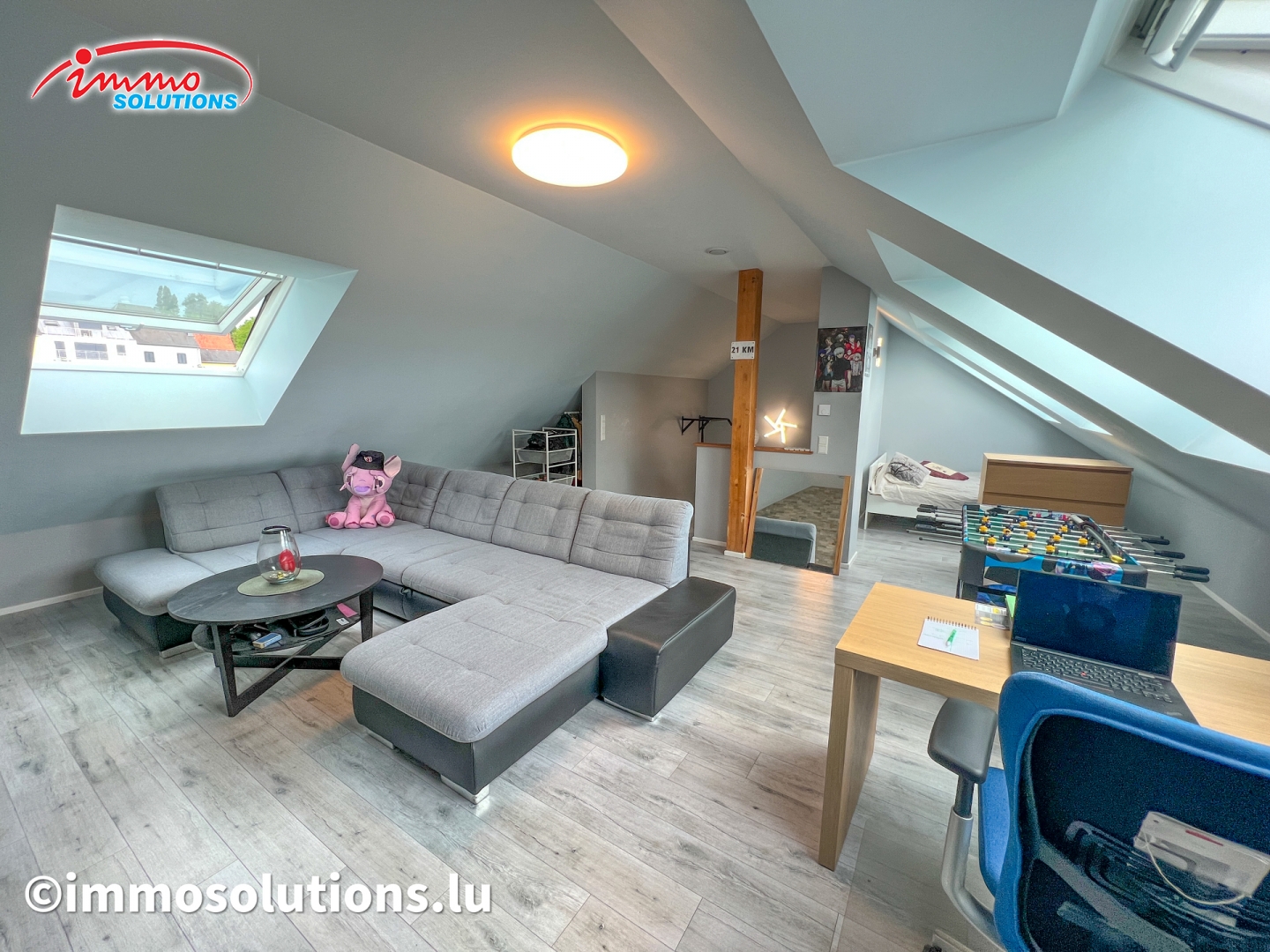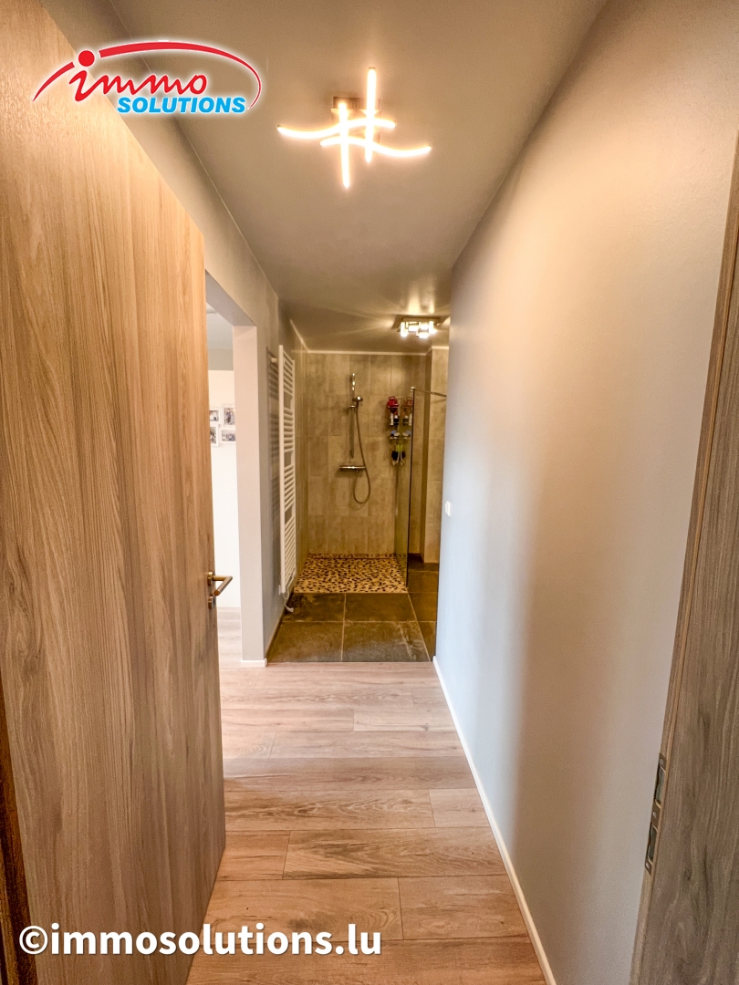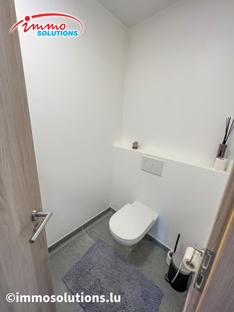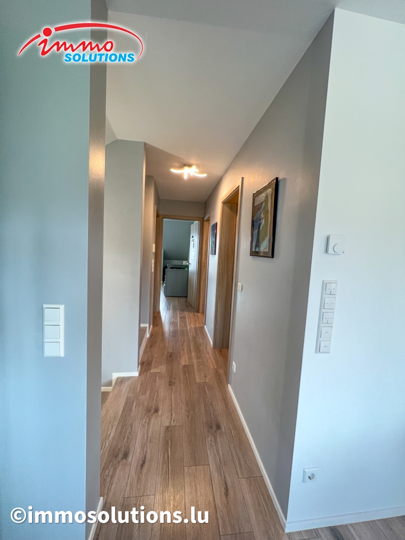 L'appartement se compose d'un hall d'entrée spacieux, d'un grand séjour lumineux avec salle à manger, d'une cuisine équipée moderne et ouverte, d'un beau balcon de 12 m², d'un WC séparé, de deux chambres à coucher ainsi que d'une buanderie privative avec débarras. À l'étage supérieur se trouve une grande pièce polyvalente pouvant être aménagée selon vos besoins, en chambre parentale, bureau ou salon TV.