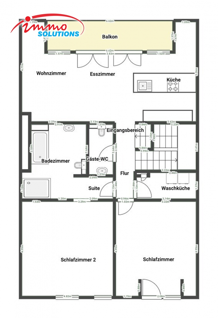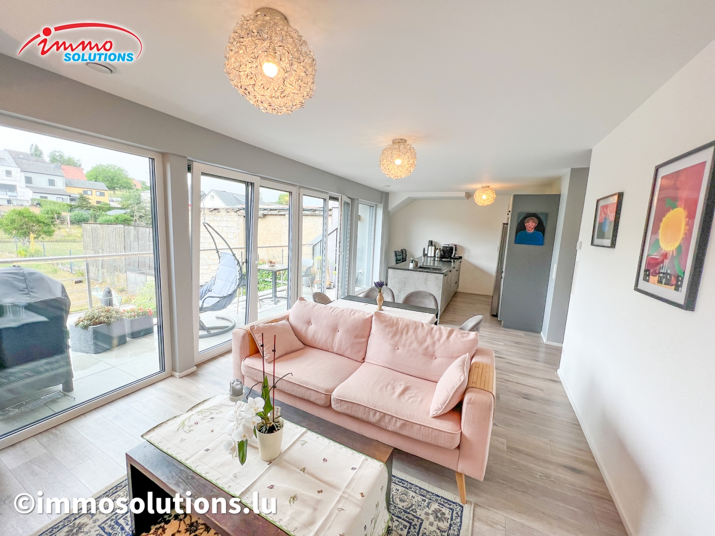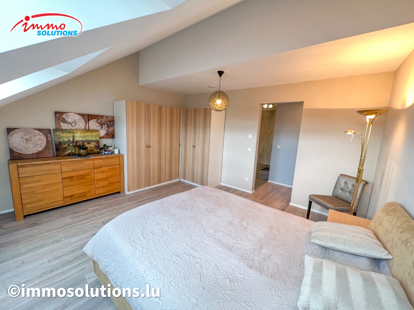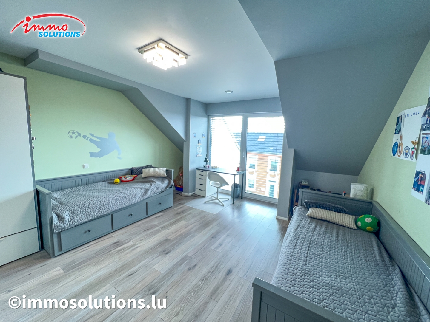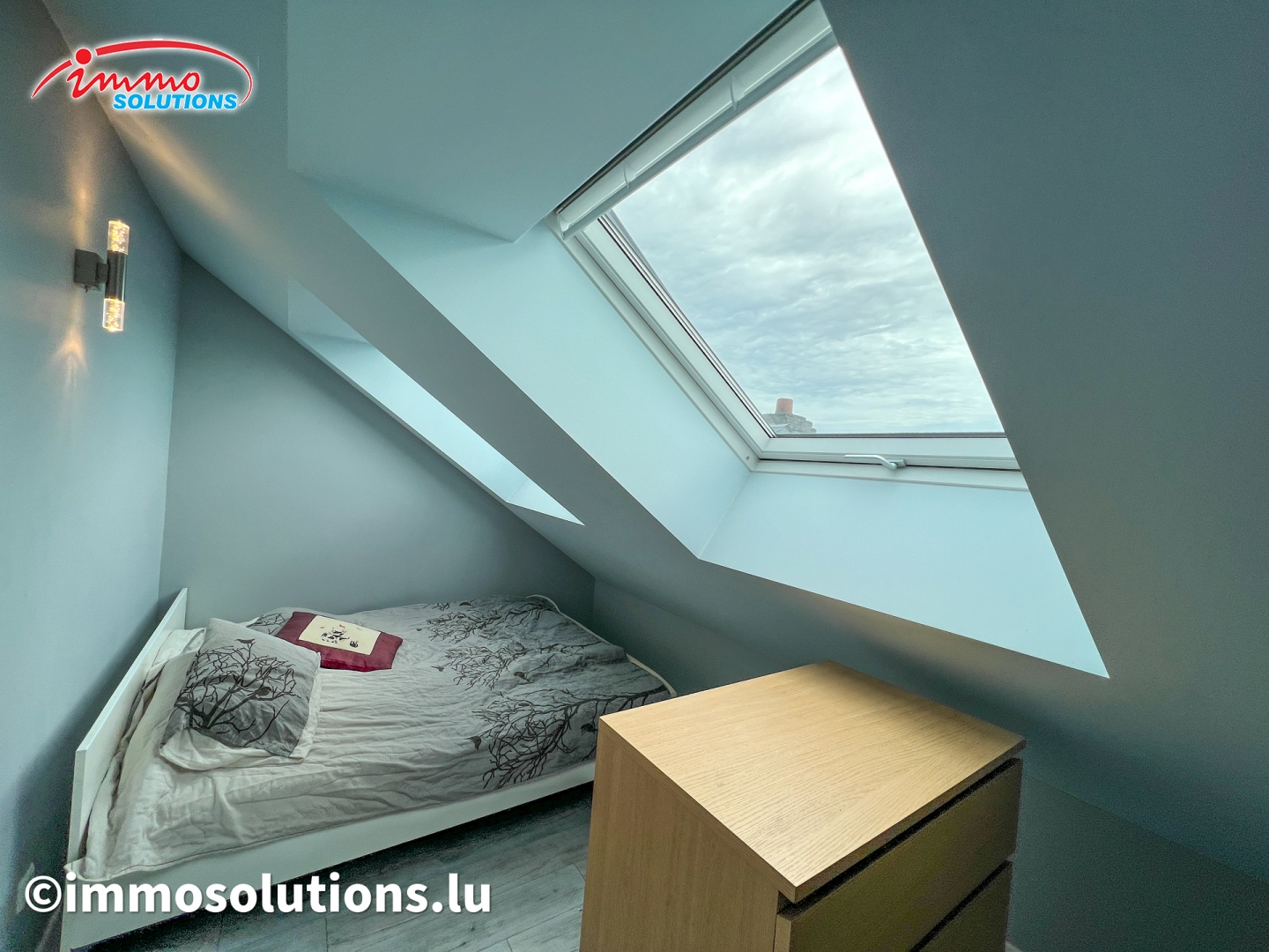 L'appartement se compose d'un hall d'entrée spacieux, d'un grand séjour lumineux avec salle à manger, d'une cuisine équipée moderne et ouverte, d'un beau balcon de 12 m², d'un WC séparé, de deux chambres à coucher ainsi que d'une buanderie privative avec débarras. À l'étage supérieur se trouve une grande pièce polyvalente pouvant être aménagée selon vos besoins, en chambre parentale, bureau ou salon TV.