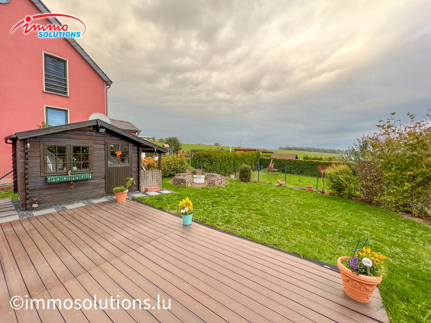Le rez-de-chaussée se compose d'un hall d'entrée, d'un WC séparé, d'un grand séjour avec poêle à granulés et salle à manger, d'une cuisine équipée ouverte, d'une spacieuse terrasse couverte, et d'un joli jardin ensoleillé avec un chalet en bois et un coin barbecue.