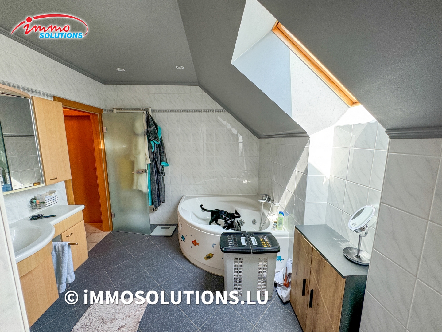 Au premier étage, vous trouverez un hall de nuit, trois chambres à coucher, une grande salle de bain avec baignoire (whirlpool), douche et WC, ainsi qu'un petit grenier pour le stockage.