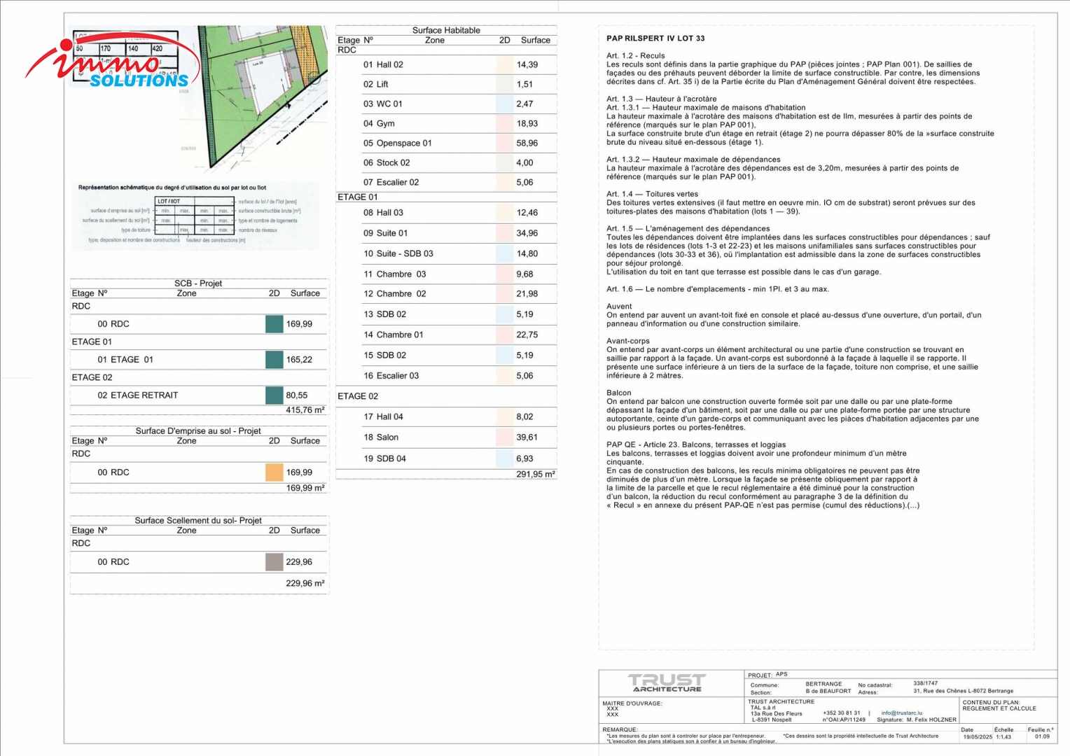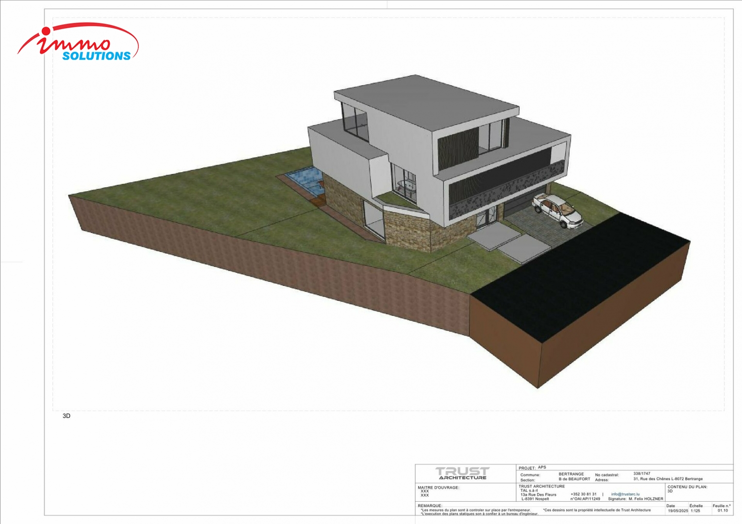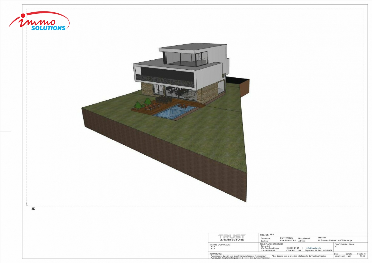 Située dans un quartier résidentiel très prisé de Bertrange, cette maison unifamiliale de haut standing est proposée à la vente sur un terrain de 7,46 ares. Le projet prévoit une surface habitable de ±292 m² et une surface brute construite de ±416 m², réparties sur trois niveaux habitables ainsi qu'un sous-sol complet. Au rez-de-chaussée, vous trouverez un spacieux hall d'entrée, un vaste espace de vie ouvert de près de 59 m² avec salon, salle à manger et cuisine, une salle de sport, un WC séparé, un local de rangement, ainsi qu'un garage intégré de 34 m². Le premier étage offre une suite parentale avec salle de bains privative, trois chambres supplémentaires, deux salles de bains et un hall de nuit. Le deuxième étage en retrait comprend un grand salon lumineux, une salle de bain supplémentaire et un accès à une terrasse de toit (optionnel). Le sous-sol dispose entre autres d'une cave à vin technique, d'une buanderie, de plusieurs espaces de stockage et d'un hall d'accès. Cette maison est dotée d'un ascenseur intérieur, de toitures plates végétalisées, et respecte les prescriptions du PAP Rilpsert IV. Les extérieurs sont entièrement aménagés et comprennent un jardin privatif ainsi qu'une piscine extérieure, tous inclus dans le prix. Le bien est **libre de contrat de construction**, ce qui vous permet de choisir librement l'entreprise avec laquelle vous souhaitez bâtir votre future maison.