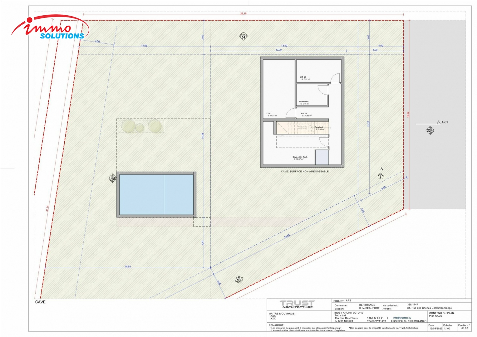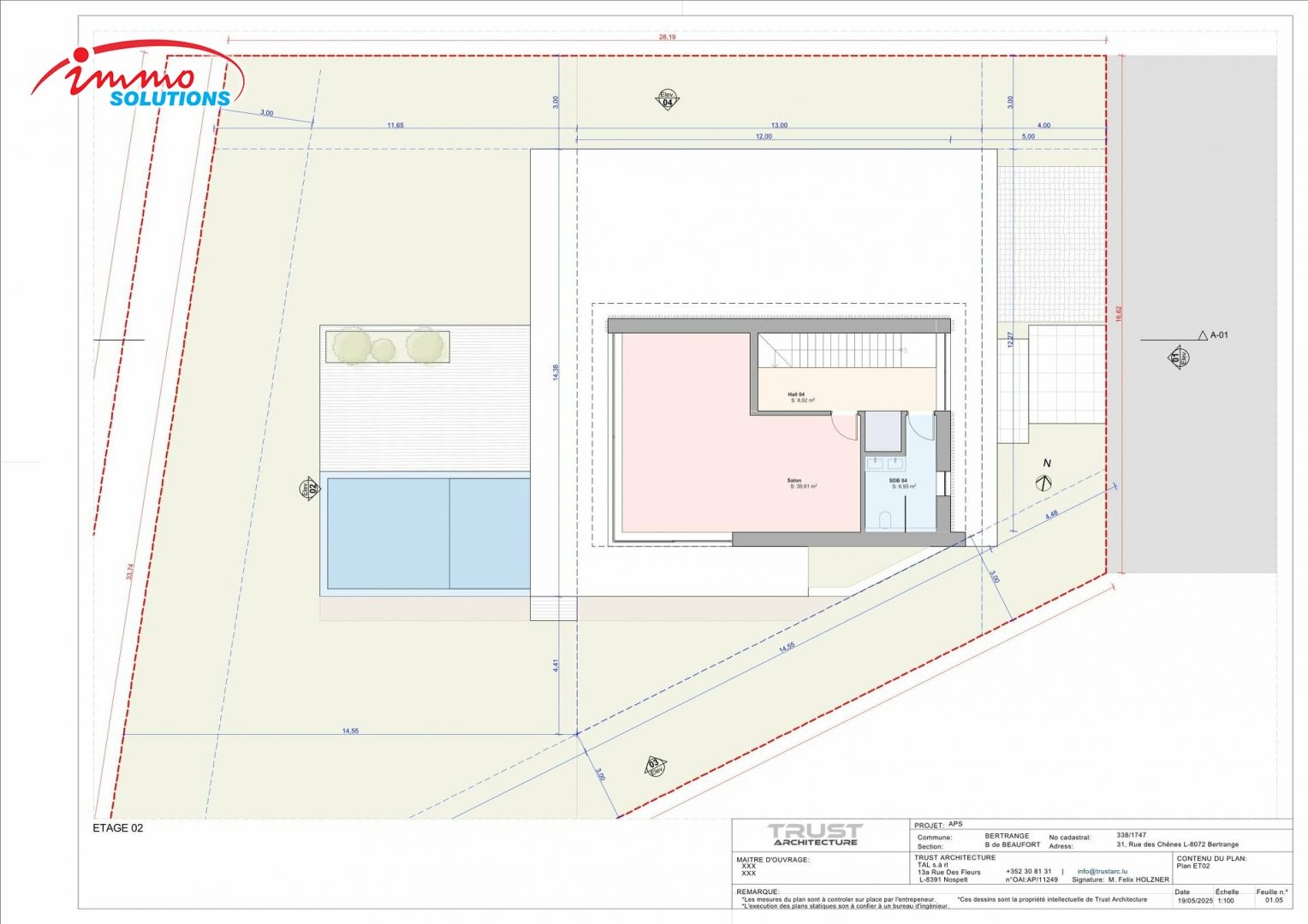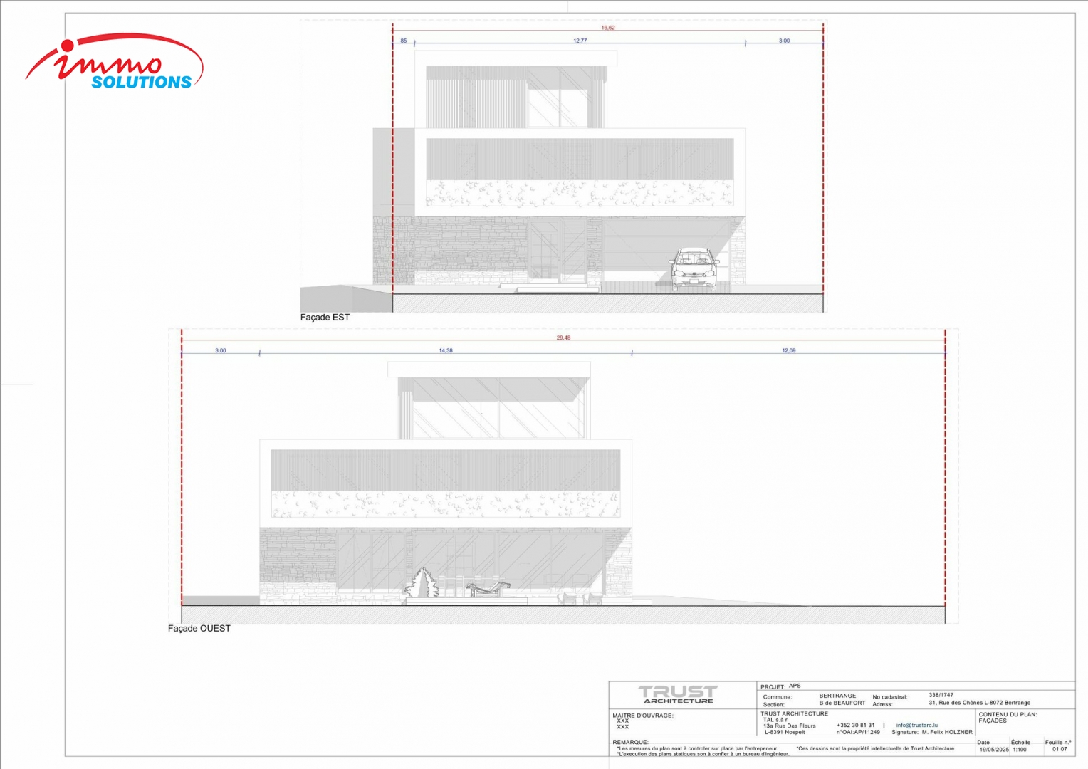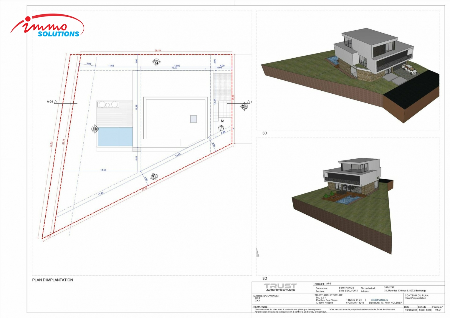 Située dans un quartier résidentiel très prisé de Bertrange, cette maison unifamiliale de haut standing est proposée à la vente sur un terrain de 7,46 ares. Le projet prévoit une surface habitable de ±292 m² et une surface brute construite de ±416 m², réparties sur trois niveaux habitables ainsi qu'un sous-sol complet. Au rez-de-chaussée, vous trouverez un spacieux hall d'entrée, un vaste espace de vie ouvert de près de 59 m² avec salon, salle à manger et cuisine, une salle de sport, un WC séparé, un local de rangement, ainsi qu'un garage intégré de 34 m². Le premier étage offre une suite parentale avec salle de bains privative, trois chambres supplémentaires, deux salles de bains et un hall de nuit. Le deuxième étage en retrait comprend un grand salon lumineux, une salle de bain supplémentaire et un accès à une terrasse de toit (optionnel). Le sous-sol dispose entre autres d'une cave à vin technique, d'une buanderie, de plusieurs espaces de stockage et d'un hall d'accès. Cette maison est dotée d'un ascenseur intérieur, de toitures plates végétalisées, et respecte les prescriptions du PAP Rilpsert IV. Les extérieurs sont entièrement aménagés et comprennent un jardin privatif ainsi qu'une piscine extérieure, tous inclus dans le prix. Le bien est **libre de contrat de construction**, ce qui vous permet de choisir librement l'entreprise avec laquelle vous souhaitez bâtir votre future maison.