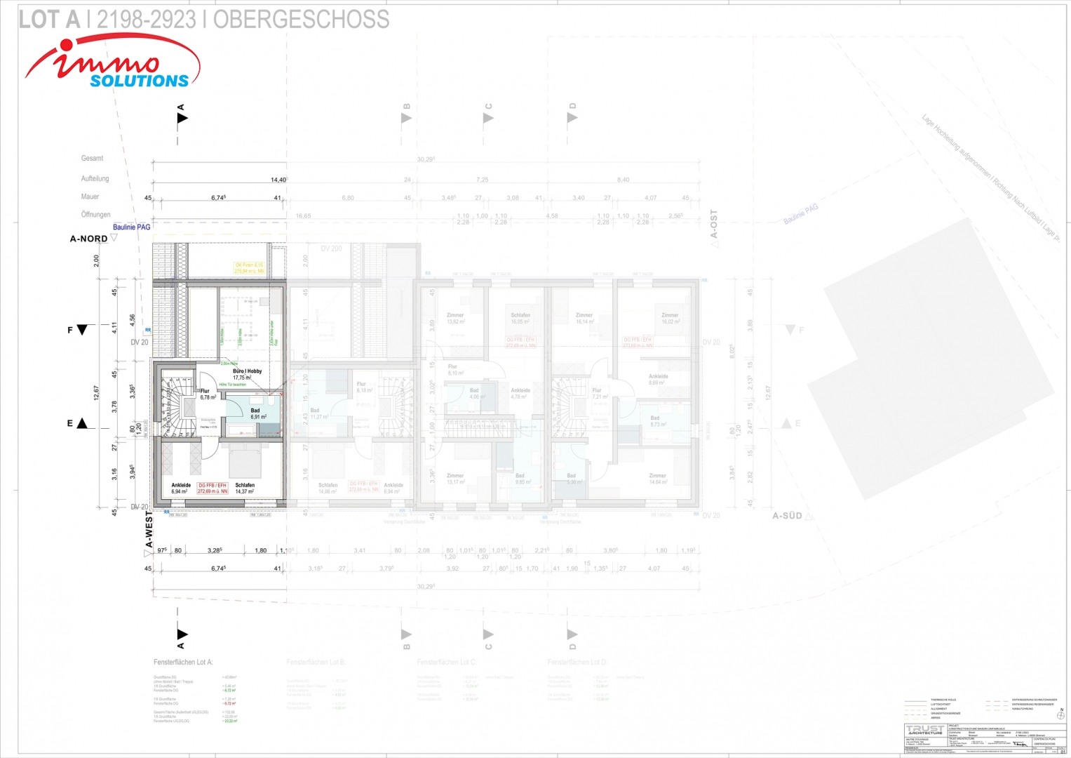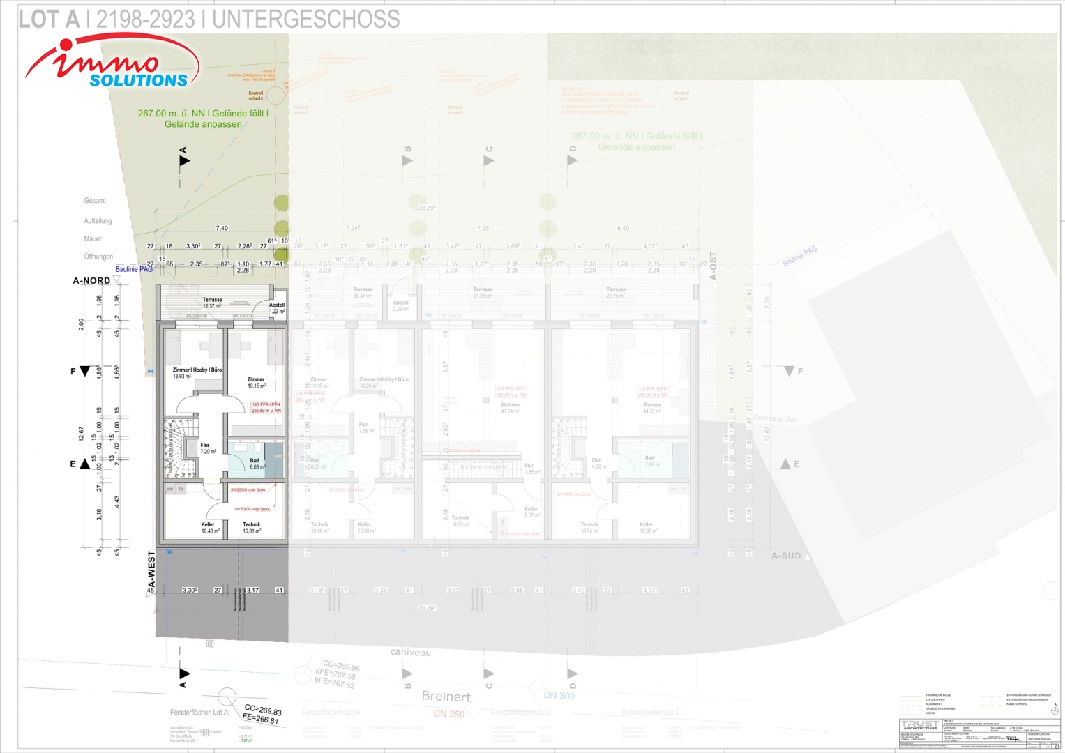 Parmi les maisons encore disponibles, le lot A séduit par son agencement soigné et ses finitions de qualité. Avec une surface habitable totale de 153,79 m² répartie sur trois niveaux, il offre un espace de vie harmonieux et fonctionnel. Le sous-sol comprend une salle de bain spacieuse (6,03 m²), une chambre confortable (19,15 m²), un espace polyvalent pour bureau ou loisirs (13,93 m²), un couloir (7,2 m²) et un escalier (5,19 m²), pour un total de 51,5 m². Le rez-de-chaussée propose un vaste salon avec cuisine ouverte (37,72 m²), un WC séparé (2,84 m²), un couloir (10,74 m²) et un escalier (5,27 m²), soit 51,3 m², complétés par un garage et un emplacement extérieur. À l'étage se trouvent un bureau ou espace hobby (18,6 m²), une salle de bain (6,91 m²), une chambre (14,37 m²), un dressing (6,94 m²) et un couloir (4,17 m²), pour un total de 50,99 m².