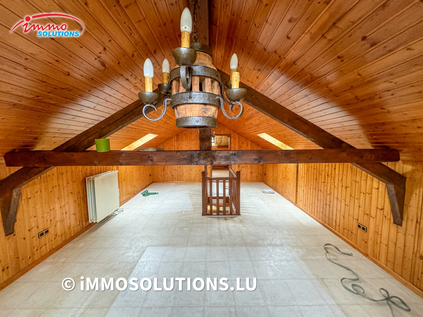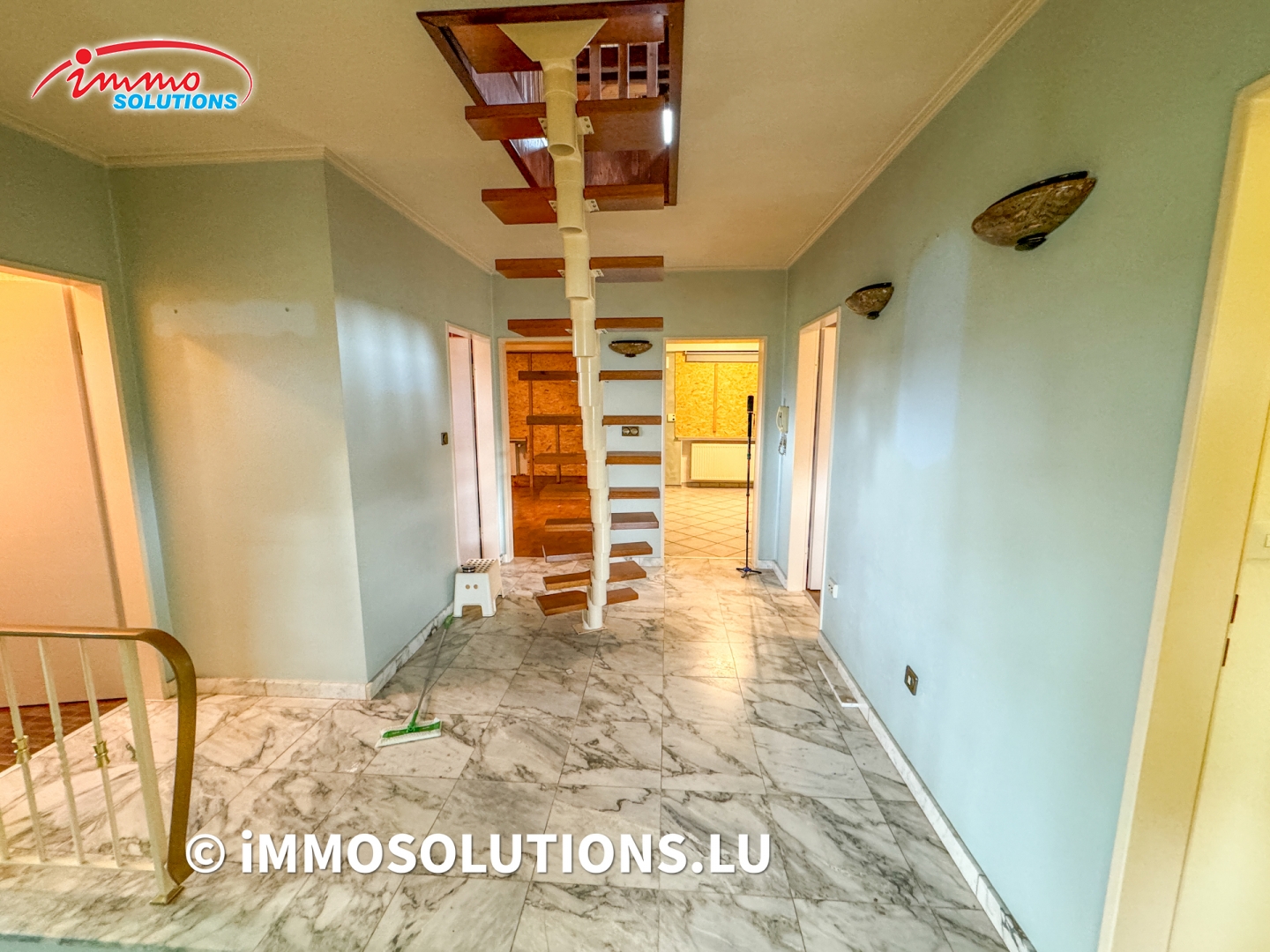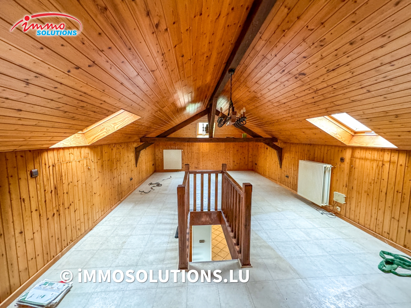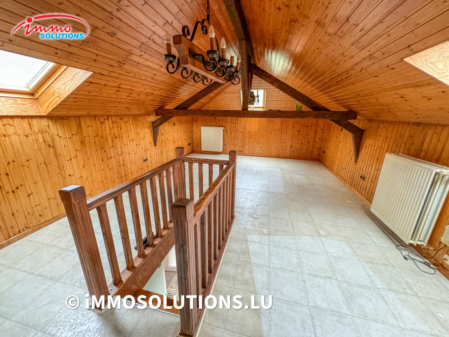 Au premier étage, un vaste palier dessert deux chambres à coucher, un débarras, une salle de bais, un WC séparé, un salon lumineux d'environ 37m² avec accès à un grand balcon, ainsi qu'une cuisine équipée avec salle à manger et accès à un deuxième balcon.