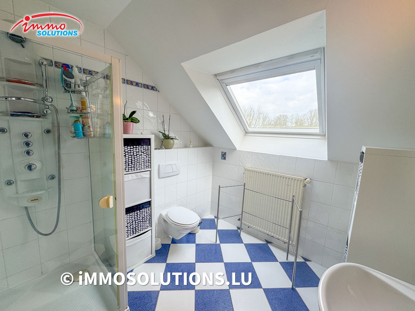 À l'étage supérieur, trois grandes chambres supplémentaires vous attendent. L'une d'elles dispose d'une salle de bain privative avec débarras, tandis qu'une autre salle de bain est partagée entre les autres chambres. Une trappe avec escalier escamotable permet d'accéder au grenier, utilisable comme espace de rangement.