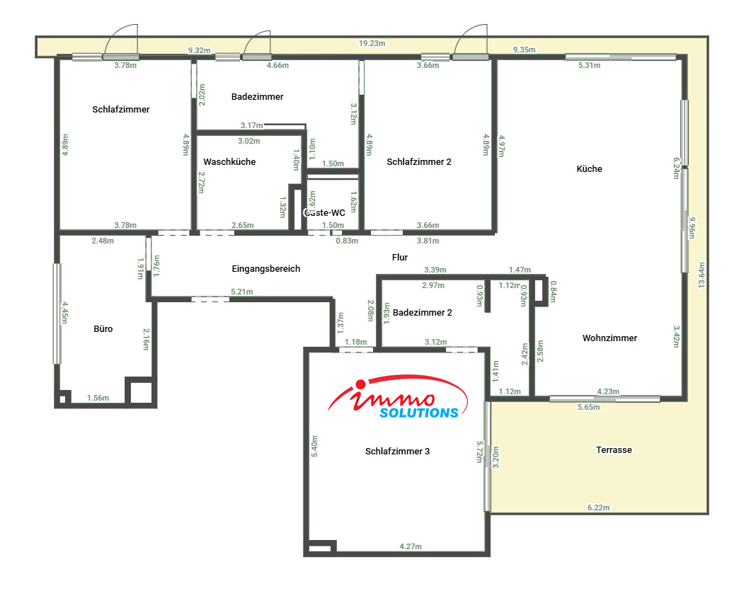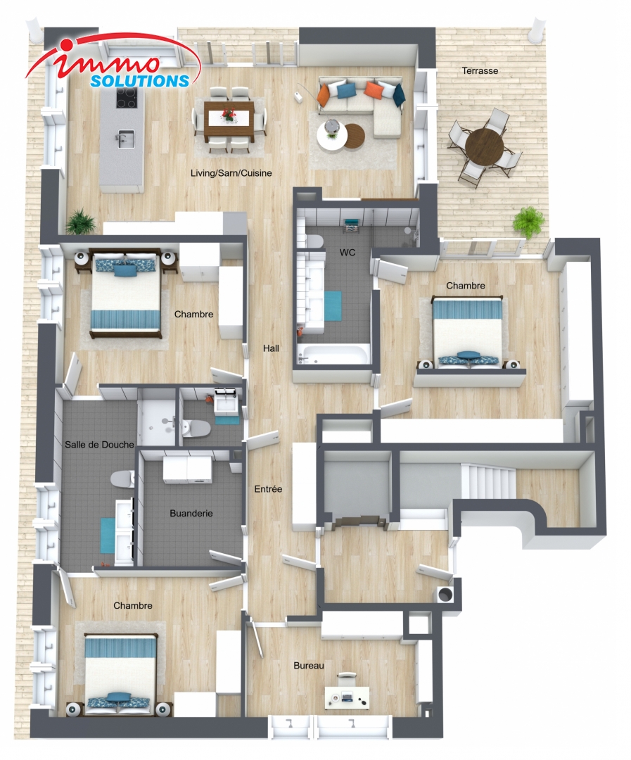 Ce bien exceptionnel, avec une très grande hauteur sous plafond et une surface habitable d'environ 158 m², comprend un hall d'entrée spacieux avec corridor, une garde-robe et un WC séparé. Vous découvrirez également un vaste séjour lumineux avec une magnifique cuisine ouverte, trois chambres spacieuses, une salle de douche, une salle de bain, une grande buanderie privative, une grande cave, deux places de stationnement intérieures, un débarras et un bureau. Une vaste terrasse d'environ 35,95 m² complète l'ensemble.